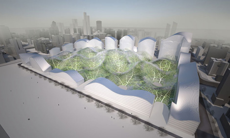 The scheme references conceptual projects by Buckminster Fuller, by envisioning a structure which is light-weight, feasible and affordable. The costs of the large canopy would be recovered by the development of the surrounding buildings.