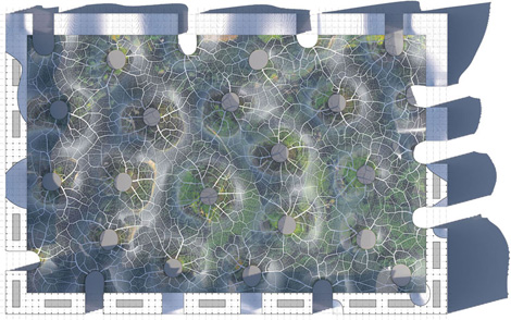 The geometry of the design is generated using algorithms which imitate veins in leaves or butterfly wings. The project’s temperature is regulated through ground source heat exchange, while electricity is generated via solar cells integrated into the roof’s surface.