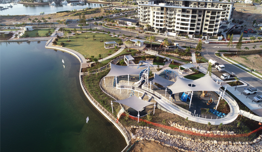 Eureka Landscapes was contacted for the instalment of playground materials, hardscape and softscape works. The playground has been designed around a nautical theme, including a play ship, a coconut rope swing, climbing nets, slides and sand and water play activities. The park also incorporates a central plaza showcasing public art pieces as well as interactive water features which will be illuminated at night to create a spectacular display.