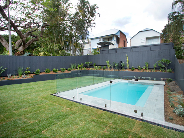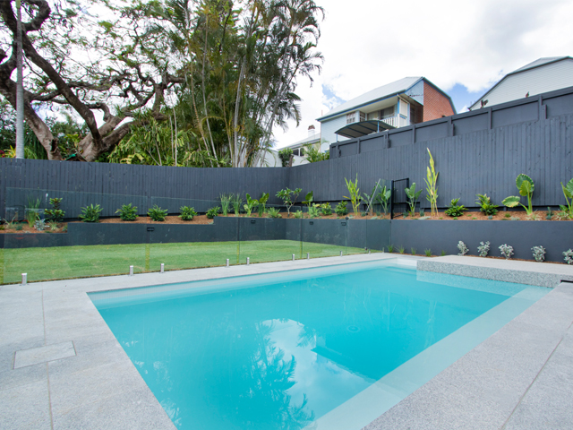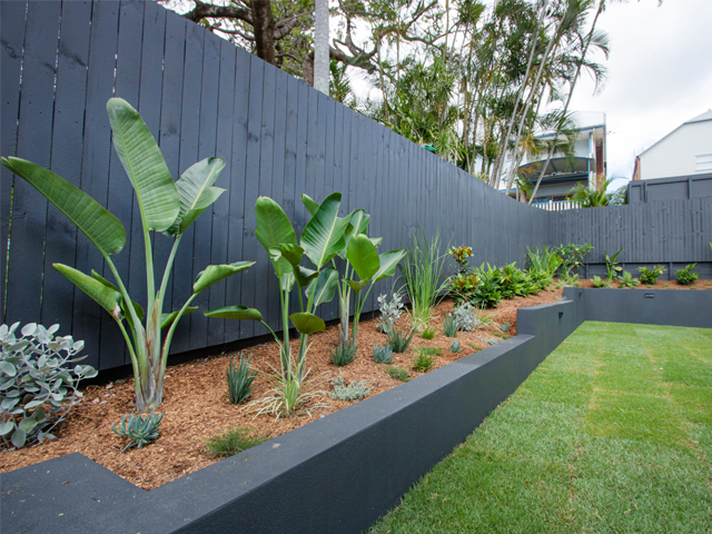 A boundary garden, featuring a wide selection of subtropical plants, was completed behind newly built retaining walls that frame the yard. A graphite paint colour scheme was selected for both the fencing and retaining walls, to complements the overall aesthetics of the space.