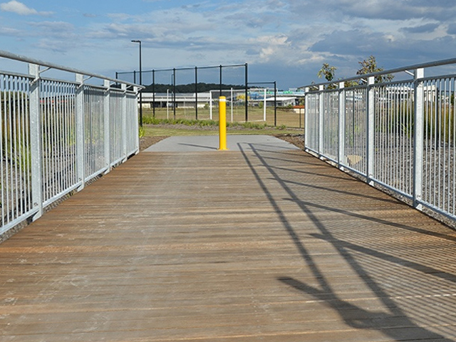 The two steel I-beam bridges (Condamine Series) are located near sporting facilities, blending in perfectly with the estate, with discreet use of steel and durable stained hardwood timber decking.