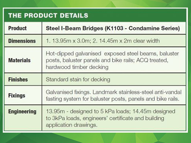 In this case, one bridge is 14 metres long with a 3.0-metre clear width, the other 14.5 metres long with a 2.0-metre clear width. Both have steel joists, baluster posts, balustrade panels, and bike rails.