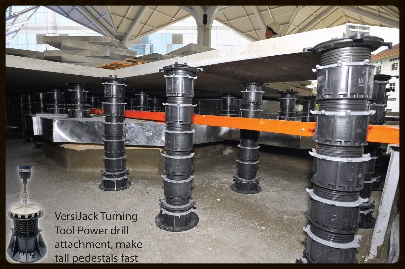 The next time you are paving or decking over a waterproof membrane, consider the Elmich range of free standing pedestals. VersiPave and VersiJack support both paving and timber decking, but unlike traditional methods, omit the requirement for glue or mechanical fixings, so the waterproof membrane remains accessible and intact.