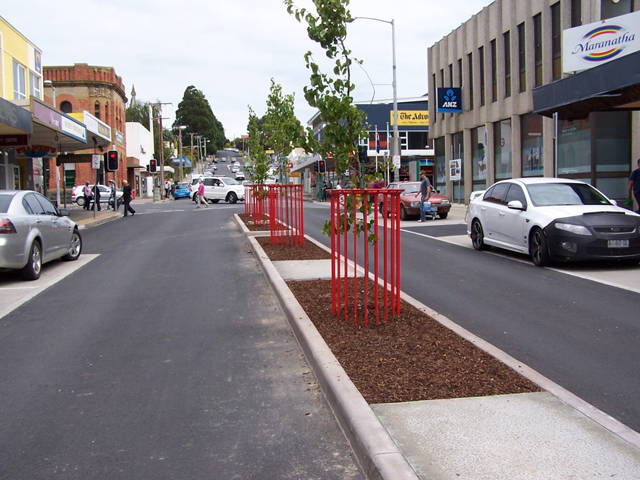 The Devonport project in Tasmania has transformed Stewart Street by “calming traffic and promoting pedestrian use” primarily by the installation of a narrow tree-lined median down the centre of this inner city shopping street. They also wanted the design to promote on-street dining by creating a unique CBD precinct with an “identifying palette”.
