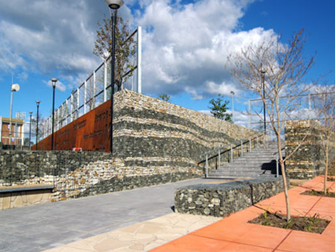 Charlestown Oval, NSW. This project was completed in 2010 and is notable for its use of different types of rocks to give an interesting effect. Another major feature of this project is the large panels of Corten steel which are part of the entrance for the sign and also is used as a feature wall. This together with the gabion walls and lush greenery has produced a beautiful public space. The gabion walls were built using Permathene's 75mm x 75mm in 4mm Galfan (Al 5 Zn 95), 4mm wire. Connections were with c rings.