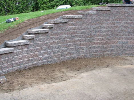 These systems rise upwards on an angle just short of vertical. Perfect for curved or straight walls, they are usually used for walls greater than 1 metre high. When built with no fine concrete or geogrid reinforcing these walls can be built considerably high to the engineer’s specifications.