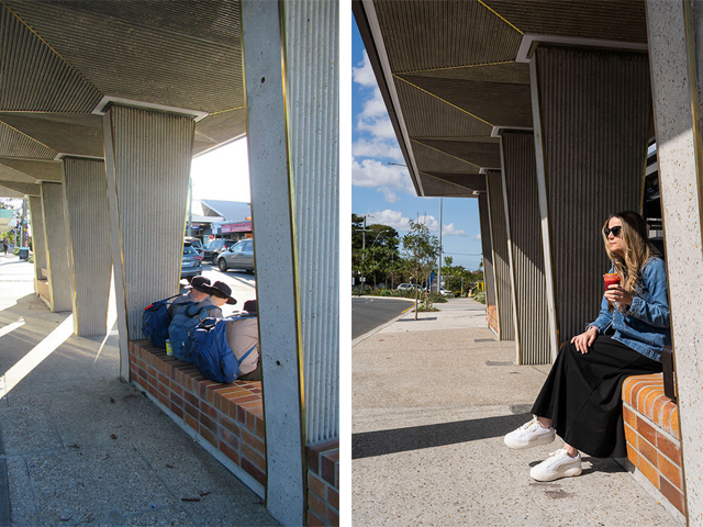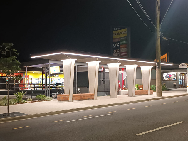 The technically-difficult design was created with ease by the Benzini team, with the structure reflecting the local character and the eclectic architectural design context of Ashgrove West. The detailing of the shelter features, textures, materials and forms abstractly reflect the local heritage bus stops, the Sugar Cane Arcade and the Art Deco Montvue buildings creating a modern twist on a classic Brisbane suburban form.