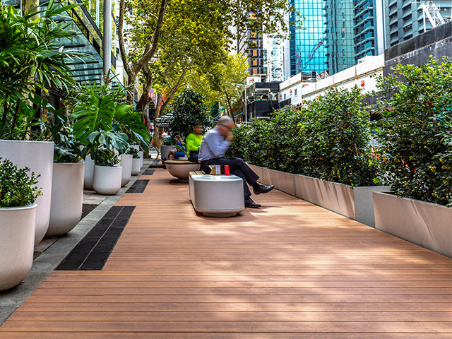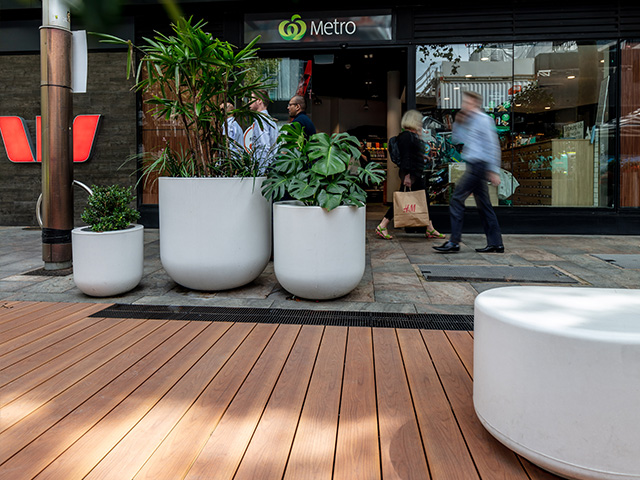 This oasis in the heart of North Sydney offers a tranquil space to escape from city life, and a place to relax for busy shoppers and workers alike. The vision by the North Sydney Council was to create a quality landscape for the public to enjoy, featuring outdoor seating, greenery and an attractive deck – a stylish pedestrian space.