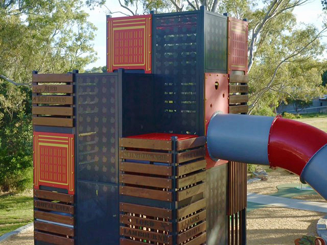 The tower is designed with a nod of appreciation towards Harcourt’s rich fruit-growing history, with traditional apple crates being the inspiration for the play equipment design. While timber paneling on the tower reflects the conventional apple crates, engraved plastic panels reflect the modern crates used today. More finer details on the tower, such as the apple motifs engraved into the plastic and perforated sheet metal, as well as the apple names inscribed into the timber paneling, create a connection to the rich fruit growing history.