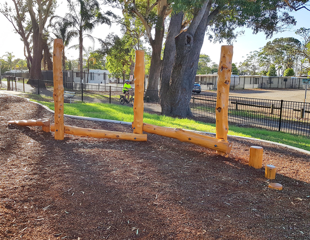A Premium Triple Swing and Bushwood Balance Trail add to the natural wood aesthetic of the playspace and complement the surrounding environment. An Inclusive Whirly Rope Spinner and Nest Swing ensure everyone can play, while Sandstone Logs provide an informal seating area so that everyone can stay.