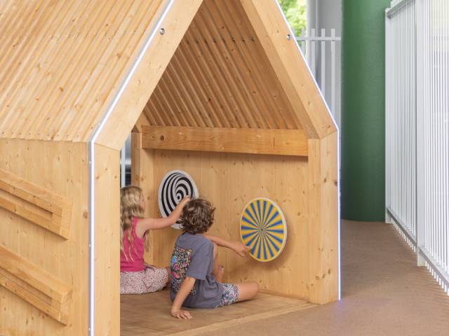 Working with one of the world’s leading playground designers and manufacturers provided the opportunity to fully customise the final outcome, allowing us to meet several highly specific design and performance requirements. The result is an adventure treehouse offering climbing challenges and the excitement of height for older children, while also catering to younger kids with various sensory play equipment and games and some low stimulation stone animals for littlies.