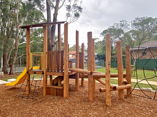 Playstructure made from a variety of timber species. Attached slide and climbing rope.