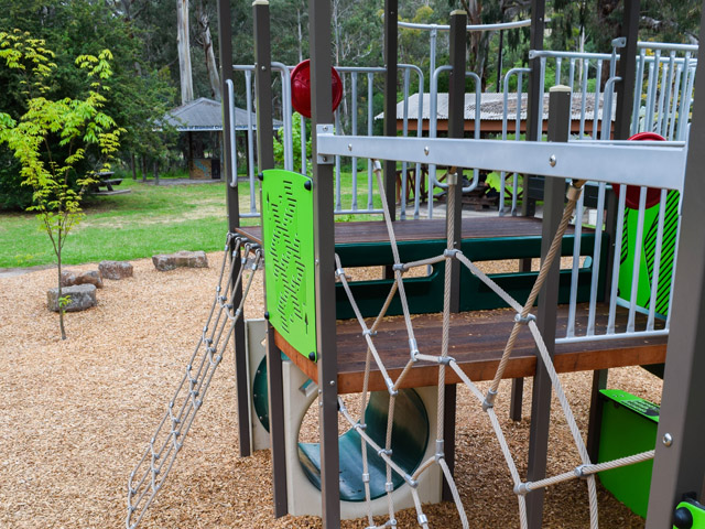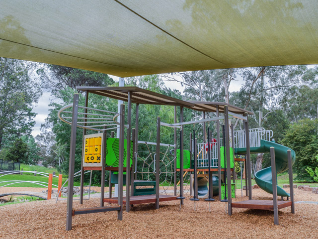 Gordon and Sheila Ferguson Park, Hurstbridge is tucked away just of the main road with a natural colour palette to complement the surrounding landscape. This park features an Omnitech ‘Extreme’ custom unit combined with a flying fox and two embankment tube slides. The extreme play unit combines monkey bars, play panels, slides and other tradition play activities that all kids are bound to enjoy. Made from durable galvanised Australian steel and locally moulded plastics, this play unit is fun and made to last.