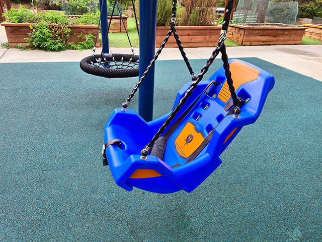Products pictured: Spinmee Inclusive Roundabout, Mirage swing seat and harness, Dragonfly seesaw, & sensory musical products.