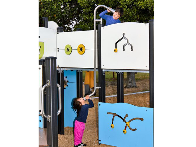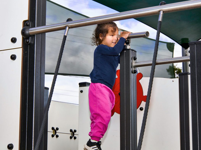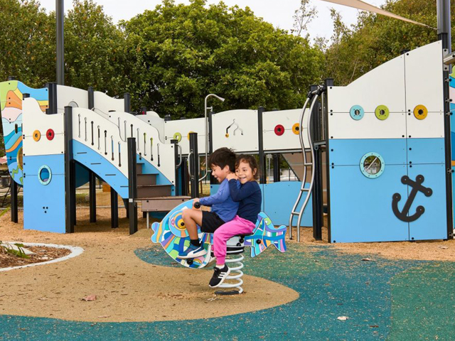The playspace at Kitchener Park also features a Fish Oceané springer (J821-GO), a swing set with a cradle seat and a flat seat (J497), and Cableway (J514). Shade sails and trees offer shade on hot days. There is a sheltered picnic area and plenty of seating for companions to sit down, relax, recharge and connect. The surroundings, including carved tree logs and stepping stones, invite nature inspired play.