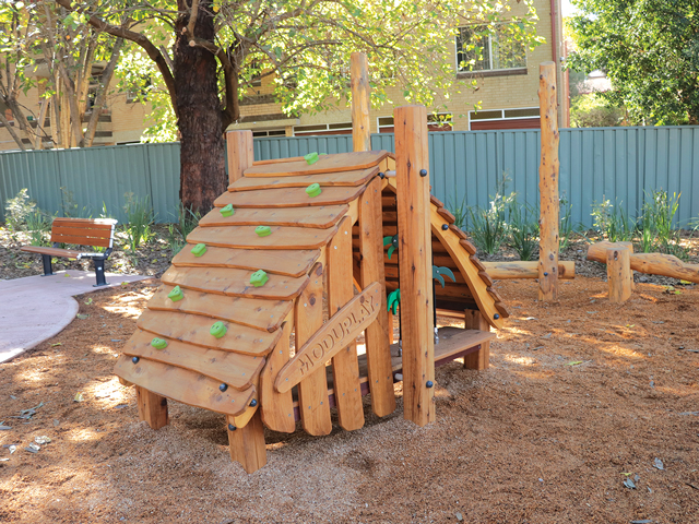 For older children, the central area boasts an accessible multi-play climbing unit with interactive elements at ground level, such as mounded trampolines and an all-access carousel. This area includes play stations with graduated challenges. Adaptable play opportunities are facilitated with the Bushwood Tropicana Bungalo and balance trail in a side garden area, surrounded by multiple pause points for caregivers and children to take a moment to rest.