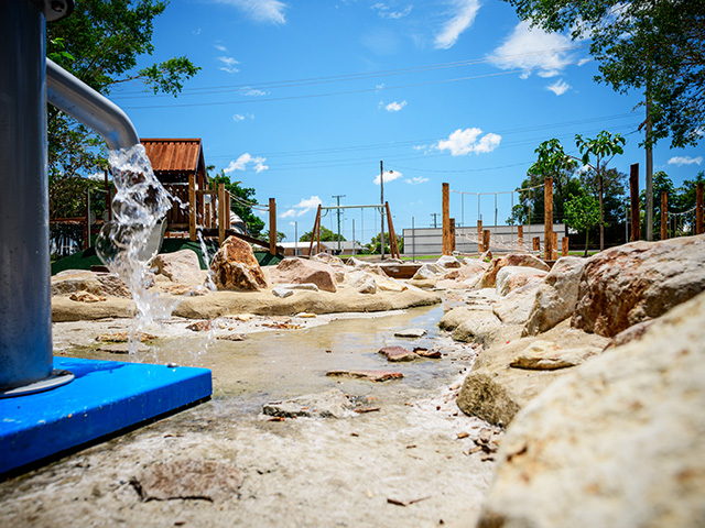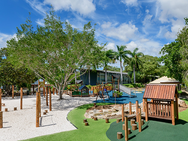 Products pictured: custom timber pod, custom timber Omnitech unit, custom nature-play creek bed, & Timber Imperia