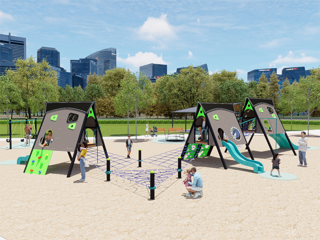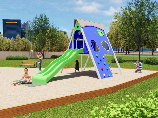 With an angled support frame modelling that of a traditional ski chalet, these spacious four square-meter decks create height within a small footprint, encouraging cooperative play between users with multiple climbers and linkages converging to the unit’s central deck. These supported interactions are important for user’s social development and are the perfect way to promote skills such as collaboration and sharing.