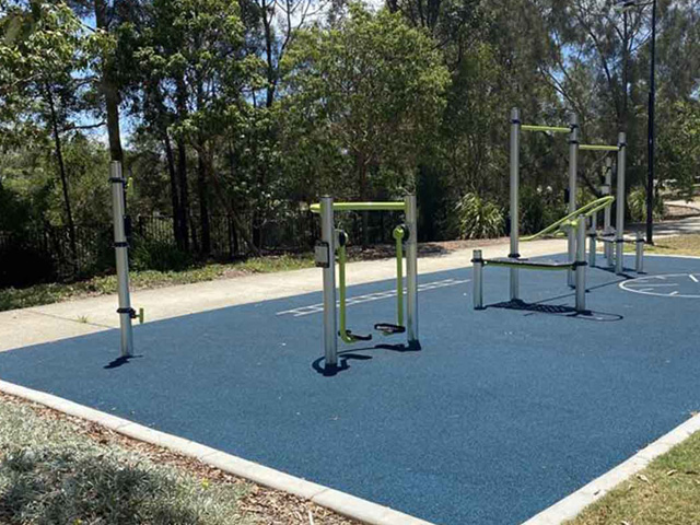 As with all of ParkFit installations in Moreton Bay, the team added a new garden bed around the existing trees to complement the project’s overall aesthetic. The lime-coloured equipment was the perfect contrast against the blue rubber surface, which Moreton Bay loved.