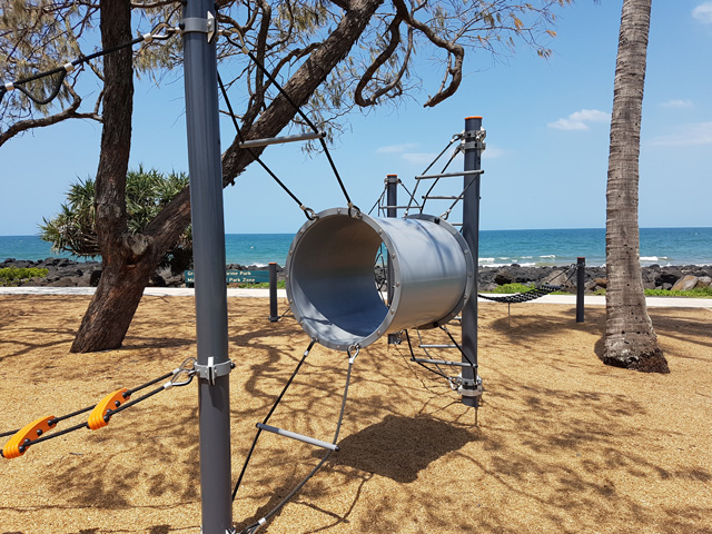 Located next to a popular tidal lagoon and patrolled surf beach, the play area was an important element in the foreshore upgrade project. Under the direction of Bundaberg Council, who desired a destination park, play equipment specialist WillPlay was contracted to supply and install play structures and softfall surfacing. Working with the contours of the planned paths and infrastructure that would eventually be installed in the park, WillPlay also designed the play zone layout, ensuring it would allow natural flow of movement around existing trees, integrate into the surrounding landscape as it developed across the project, and offer unobstructed views towards the ocean.