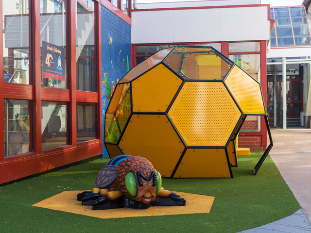 The second playspace features a custom-made bee hive cubby with a mass of multilevel hexagonal cells resembling honeycomb, which is guarded by a climbable Australian native blue-banded bee. A striking mural on the school wall connects the space, depicting more bees visiting Australian native flowers. Both educational and imaginative, this space is designed for younger children to explore and learn about the vital role bees play in nature.