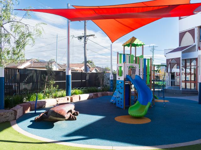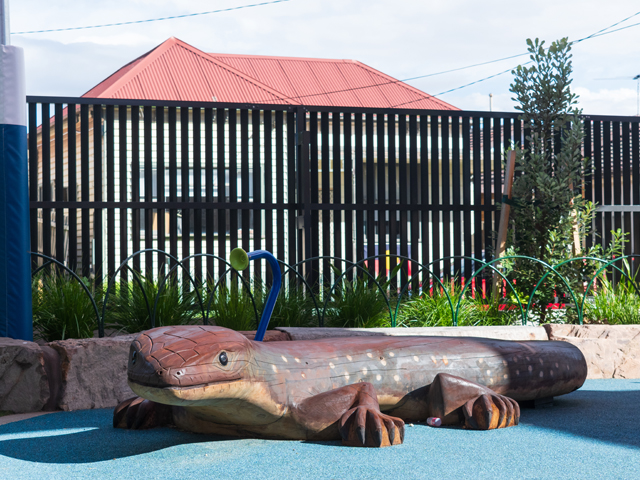 The third and main playspace is the new playground, featuring a play structure with dual slides and climbing elements. A 3-meter-long hardwood timber skink watches over the children as they play. The play equipment is anchored by impact-absorbing rubber surfacing and shaded by a sail structure. Mudstone boulder edges and hardwood logs not only provide protection but also help retain the garden beds, creating natural boundaries for the playscape. The new space is surrounded by irrigated garden beds, adding a touch of greenery, enhancing the overall environment, and providing protection from the street.