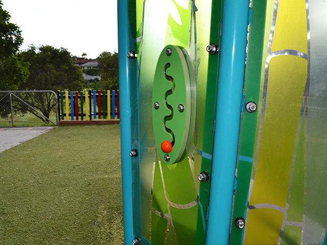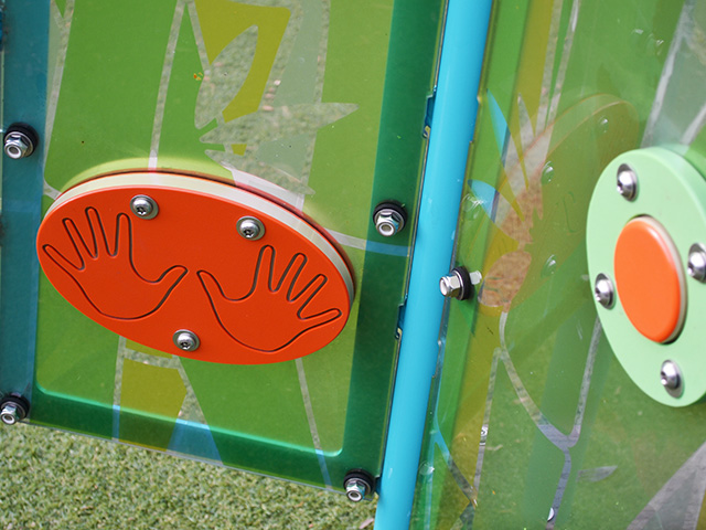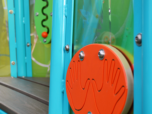 The translucent bamboo panels, leaf patterns in the roof, and the natural wood-like bench bring the benefits of nature to the Quiet Grove. The Quiet Grove is equipped with five different activities that are proven to help soothe the mind and body. They provide children time to focus and alleviate stress that overstimulation can cause. Located both inside and outside the Quiet Grove, these activities allow multiple children to self-soothe by spinning, pushing, clicking, and moving different objects.