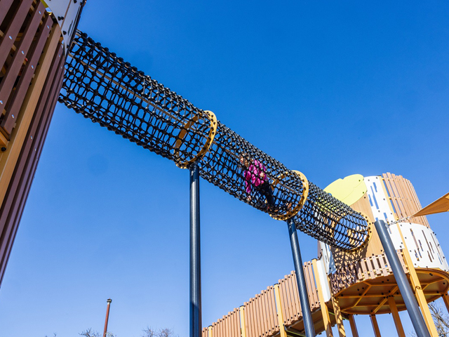 The play activities found throughout the custom-designed structure engage children in fun, active and imaginative play. Two tall round towers are connected by a dizzying suspended rope tunnel. A ramp provides access to the smaller tower and wonderful views over the surrounding parkland. A thrilling giant tube slide – the longest slide ever installed by Proludic – is attached to the tallest tower! The slide includes windows that allow light to shine through the tube, adding even more fun.
