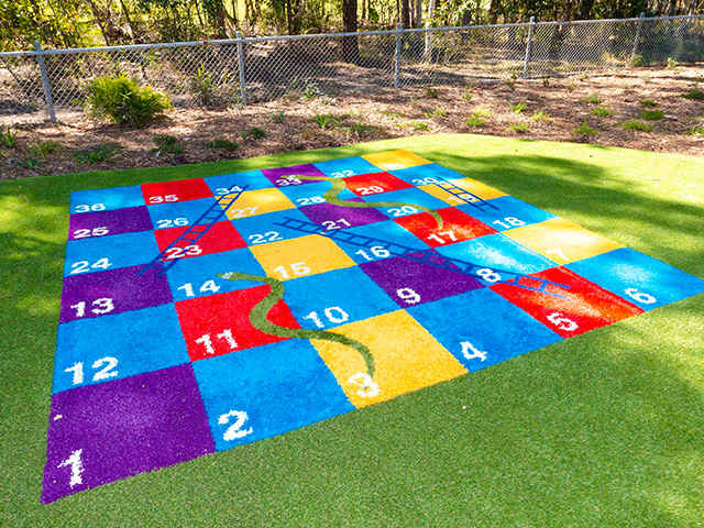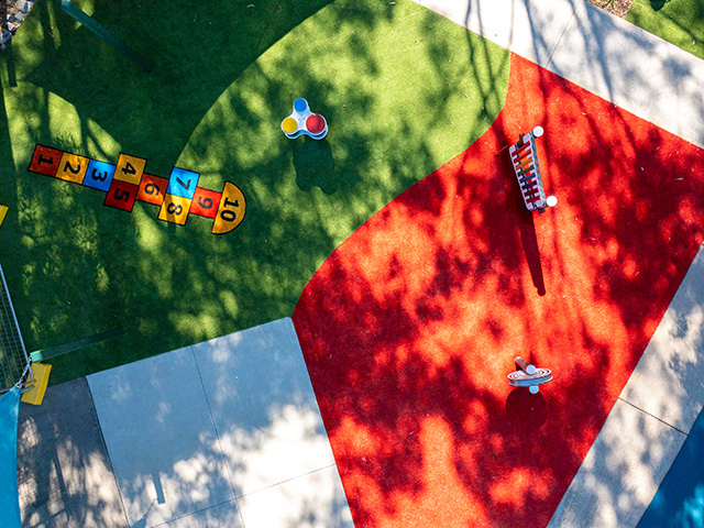 Vibrant rubber and synthetic surfacing designs, a Fusion Multi-Sport Goal End, and a sensory area are the featured elements of this playground. The most colourful update to the play space was the addition of the synthetic grass art and musical sensory items to the musical area.