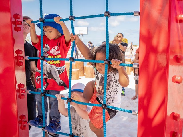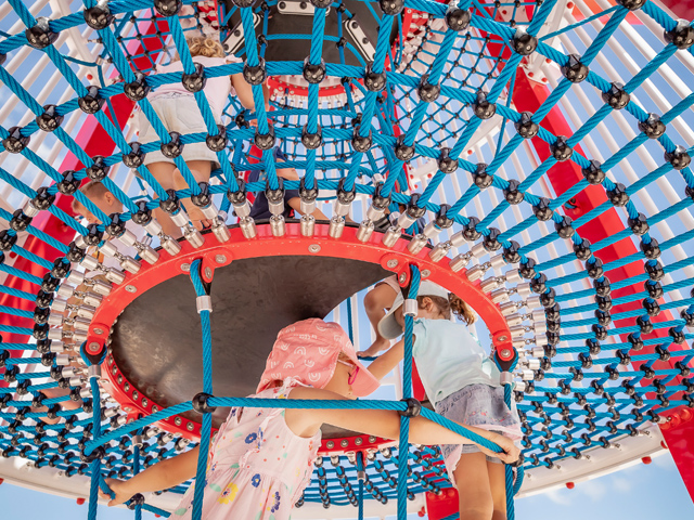 Offering myriad play opportunities, the hard-to-miss focal point includes internal rope climbing challenges and a choice of two levels of slides to take landlubbers back down to the ground. Geared toward older children as well as adults, the structure offers a birds-eye view for the adventurers who dare to climb to the top, giving them prime position to look down at the little ‘yabbies’ playing in the sand below.