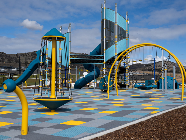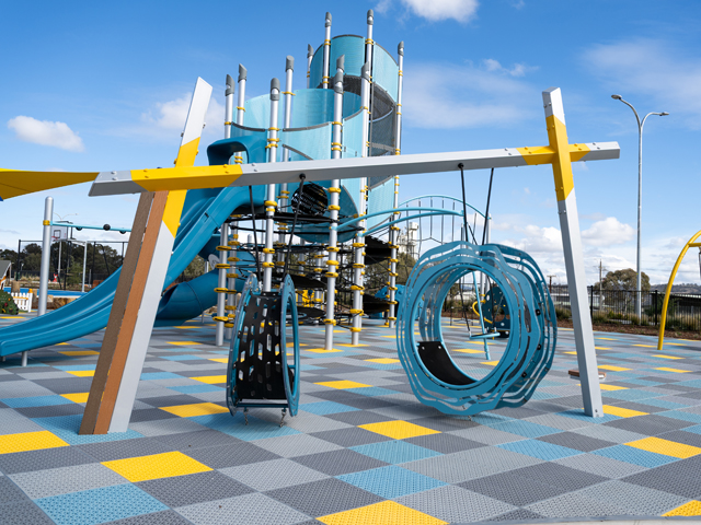 The spectacular Super Netplex Towers are the park's central feature, with multiple free standing elements surrounding the towers. The design boasts numerous accessible and inclusive pieces making it a truly engaging experience for children of all ages and abilities. The two stunning towers linked with a belted bridge with perforated holes for easy viewing. The centre spiral belting with grippy texture provides an easy way for everyone to climb to the top for a whoosh ride down two slides. Clear sightlines enable kids to enjoy the view from the top while caregivers monitor the activity from the ground. Lots of unique activities equals lots of fun!!