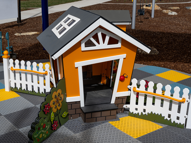 The playground begins with an accessible carousel and fun inclusive pieces with a TopsyTurny Spinner and Oodle Swing. Parkequip's new Forma range makes an appearance with the Fox Den Hangout which offers kids a place to escape the hustle and bustle of the busy playground. Belting cutouts, open sides and angled positions allow for either solo time or interaction with others. The gentle rocking motion is comforting, and the variety of materials provides visual and tactile interest.