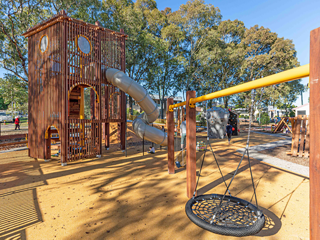Dual swing set with rope basket and rubber swing seat. For ages 3 and up, with a range of colour options.