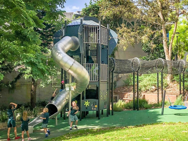 Play is everywhere, at every level of these large multi-play structures that are accessible for several age groups. At the ground level, there are play panels, climbing walls and hammocks. More experienced children can climb up the standard stairs or rope stairs inside the structure to get an adrenalin rush. Higher up in the structure, they will find sometimes-asymmetric playhouses perched at the top. They can gather, hide, and invent a thousand tales that they can fully experience, creating their own imaginary world. They can move between towers by crawling through a steel-wire tunnel or making their way across a gangway, thrilled by the plunging drop below. Large kayak or spiral slides provide a dizzying ride down!
