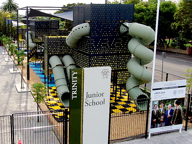 Arguably Australia’s most impressive school playground, this playground at Trinity Grammar Junior School in Kew, Victoria, provides not only a statement piece at the most visible corner of the junior school but a play structure that offers limitless play and fun for students across all years.