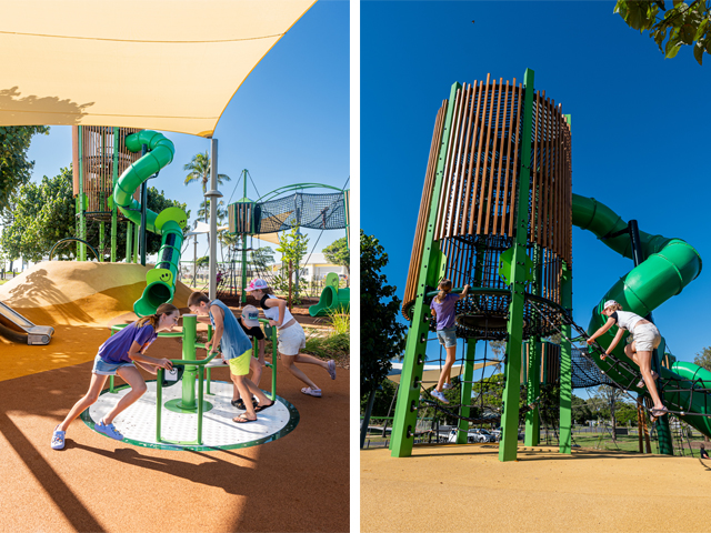 At the heart of WillPlay's contribution is their end-to-end service. The company meticulously designed the Moore Park Beach playground, manufactured the components in their Bundaberg facility, and expertly installed the entire space. The undisputed star of this new play haven is a bespoke 7.3-metre-high play tower. This impressive, custom structure, a hallmark of WillPlay's Bespoke Systems range, offers challenging climbs and rewards adventurers with stunning coastal views before they brave an exhilarating 7.3-metre slide back down. It's a feature guaranteed to capture the imagination and test the limits of older children and teens.