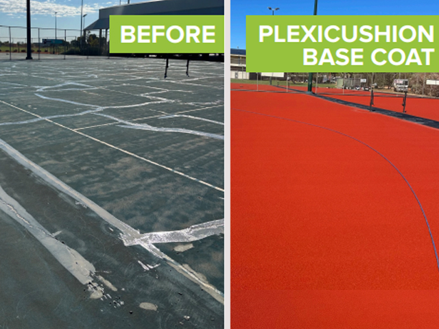Cracks in the asphalt and road base below were repaired and sealed to prevent the ingress of moisture and further damage. Plexicushion Prestige was then applied as the new surface coating. The new cushioned surface provides shock-absorbing properties that will respond to the body impact and reduces fatigue on the legs, knees, ankles and feet of the players.