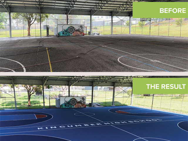 Kincumber High School’s two asphalt courts had become worn over time, with a bony uneven surface that impacted safety and usability for students. The school sought a solution that would improve both performance and appearance while providing long-term durability in a highuse evironment. The courts were levelled using two coats of asphalt resurfacer, followed by two coats of Rebound Ace Synpave to create a smooth, slipresistant finish. Royal Blue and Ocean Blue were used as the primary colours, with Terracotta accents featured on select areas of the courts. The school’s name was also applied between the courts as part of the refreshed, custom design.
