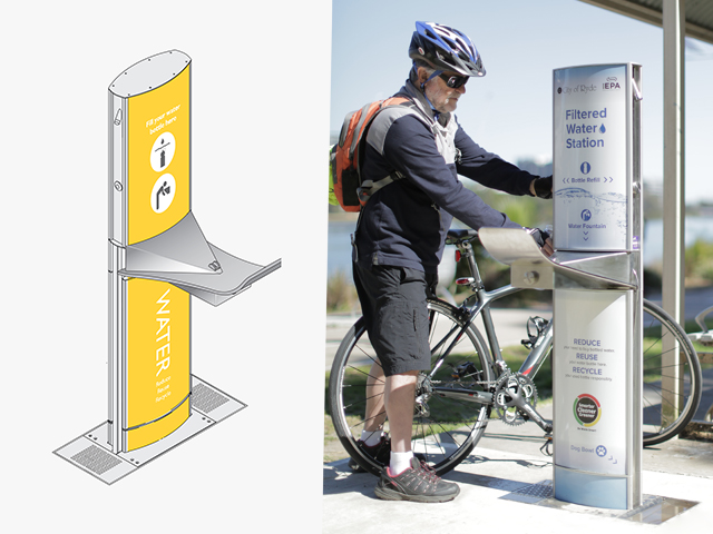 Each design features two anti-bacterial bottle refill nozzles on either side of the unit, and can be configured with one wheelchair -accessible drinking fountain basin or two basins aligned at different heights. Filters, water meters, remote chilling and dog bowls are optional features that may also be included.