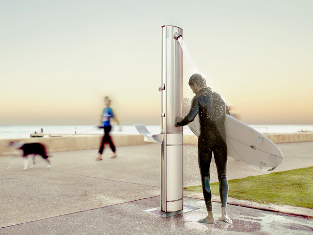 The Aquafil FlexiShower is the signature 2100mm-high outdoor shower station designed by CIVIQ for coastal public environments.