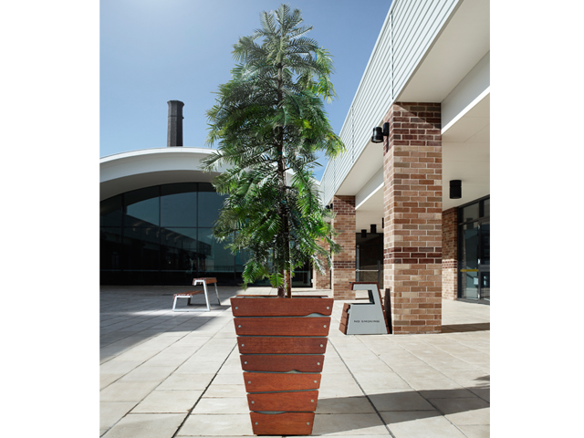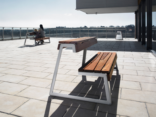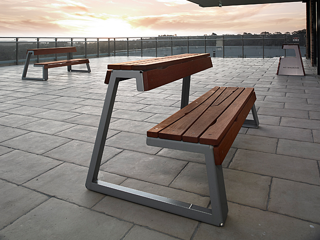 The brief for the project was to design seating and furniture for the outdoor courtyard and viewing platform. The design needed to be in keeping with the architecture of the building that references the sandstone escarpment and horizontal lines of the distant mountain view. The benches were to be used by laptop users, tourists, children, the elderly, people socialising and individuals, so flexibility in design and use was paramount. The collection features a unique multi-function table/bench seat solution, rubbish bins and planters, all of which are freestanding and portable.