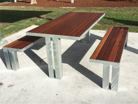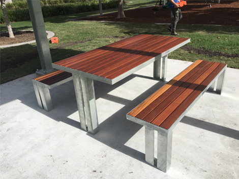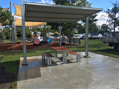 This structure, installed for Brisbane City Council at Water Front Park, Newstead, offers a maintenance free hot dip galvanised steel frame (40 years to first maintenance) with a sleek looking, and hard waring ‘Rosewood’ table and seating setting combining heavy duty galvanised steel with Hardwood Timber for a great looking outdoor furniture solution. Steel Post & Rail park shelters are ultra-durable and maintenance free through use of heavy duty, hard wearing galvanised steel framing and componentry. Our structures look fantastic and are perfect for public open space through their design attributes. All of our structures can be customised to suit preferences for features such as roof design, optional batten screening, roof footprint and coverage, footing requirements (flood zone etc).