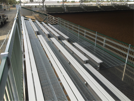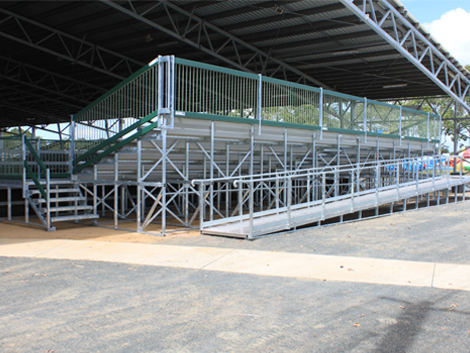 Steel Post & Rail’s most recent grandstand installation for Bundaberg City Council included tiered seating with a well-integrated wheelchair access ramp and wheelchair seating area to allow spectators in wheelchairs to easily access the raised deck viewing area. Applied to our standard ‘Raised Deck 5 tier Grandstand’ seating, the access provisions were specifically designed and built within a restricted footprint for the overall structure.
