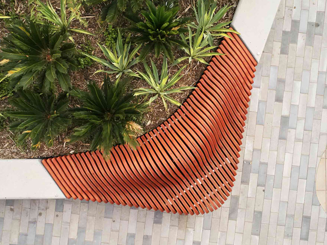 The organic forms of the furniture elements were created by combining adjacent curved panels that incrementally changed shape over the length of the bench. The rubberwood ply material selection was integral in being able to achieve these forms. The rubber wood ply, combined with other robust materials such as stainless steel and precast concrete, was featured across the entire furniture suite to create a holistic and considered solution.