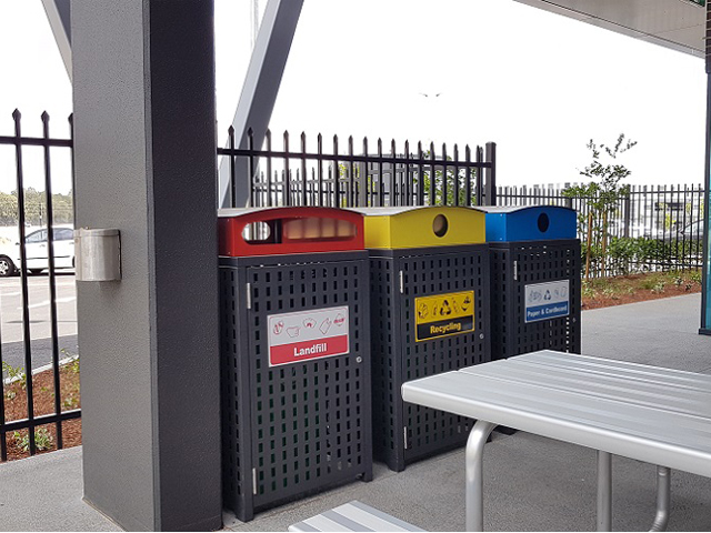 The construction program was fast approaching practical completion and needed a supplier that could be trusted to quickly manufacture colour-coordinated recycling bins for the cafeteria area. Astra was able to perfectly match the requirements for matching the building colour with the bins, plus include the individual waste stream coloured chutes (with internal rubbish sliders) and printed signage. Athens wheelie bin surrounds and recycling bin signage are designed and manufactured by parent company Area Safe Products Pty Ltd in Sydney.