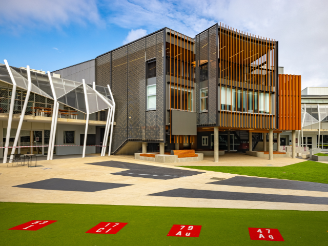 All pieces were made with StraBe's TimbAlloy aluminium battens and powder coated in Pale Eucalypt. It gives the warmth of timber with the durability of aluminium, and no ongoing maintenance for the school.