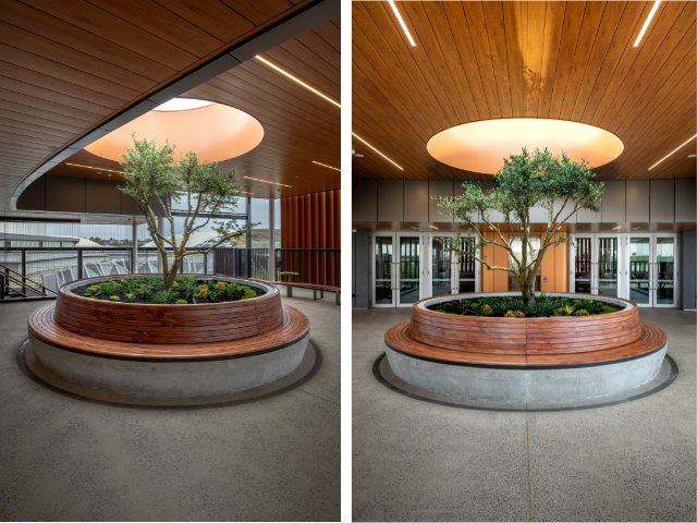 - Custom curved seating around the central tree