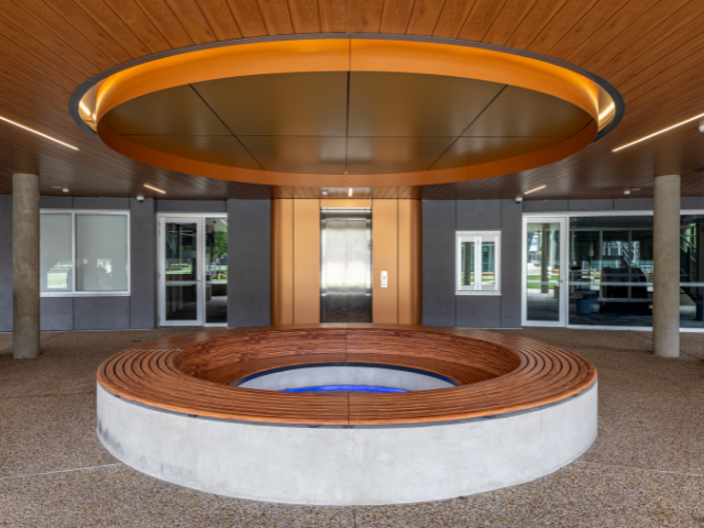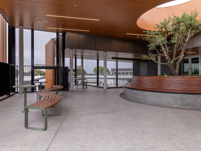 That thinking shaped the furniture StraBe delivered for the new Islamic College of Melbourne Admin & Wellness Centre. StraBe worked with the project team to create a series of informal gathering spaces, including custom curved seating around the central tree, a conversation pit, curved Lemo benches, café tables and more throughout the centre.