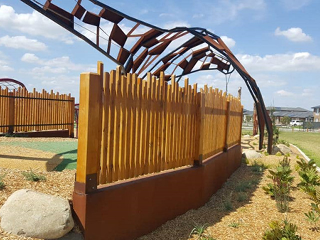 TRJ Engineering designed and manufactured the shelter and walls at Megasaurus Park. TRJ built the walls with COR-TEN steel in order to complement the park’s intricate design and to ensure product lifespan.