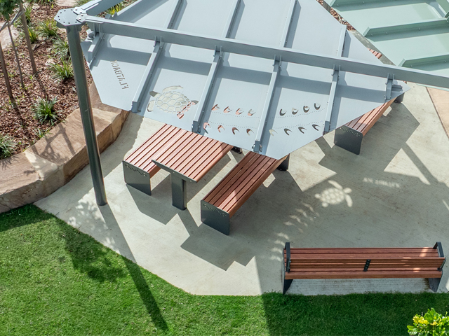 To keep the precinct cohesive, GX Outdoors supplied a complete suite of coastal-grade assets, including Pandanus permanent shade, Hyve Table Setting and Bench Seat, Atessa Dual Bin Enclosure and a Reviva Drinking Fountain, so every element reads as one place.